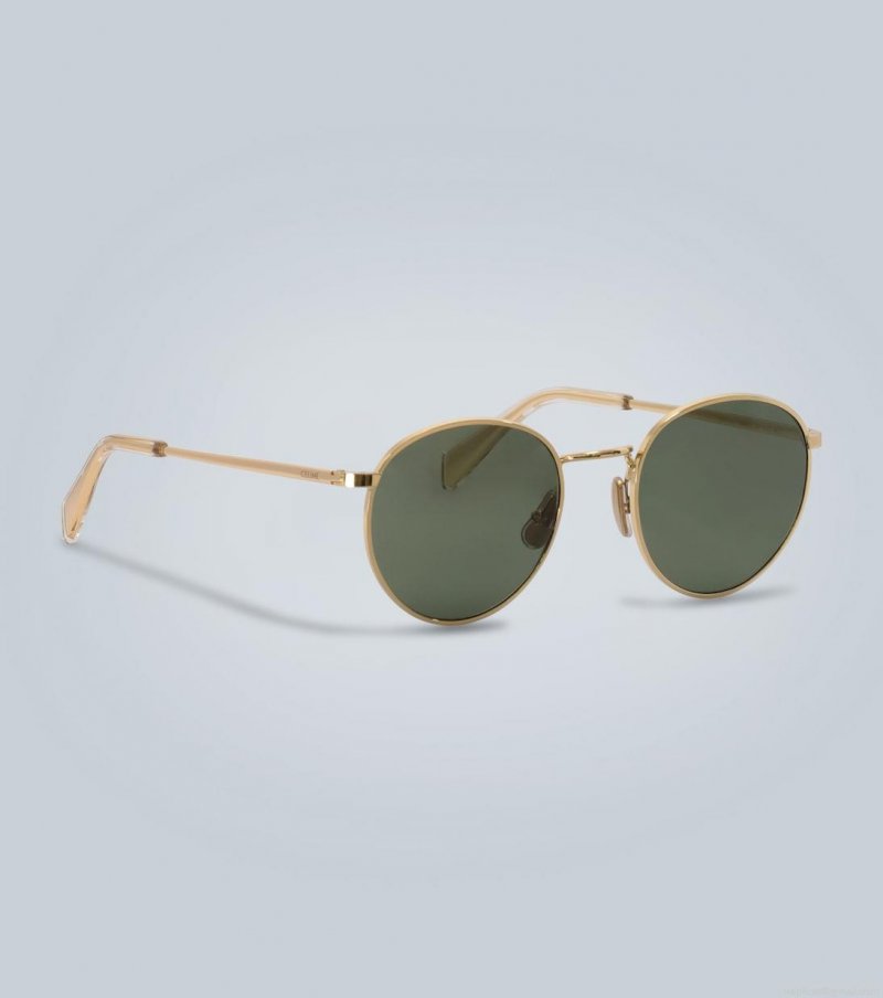 These Round frame sunglasses from Celine Eyewear feature a gold metal frame, bottle green tinted lenses, and come with a logo-embossed hard case.