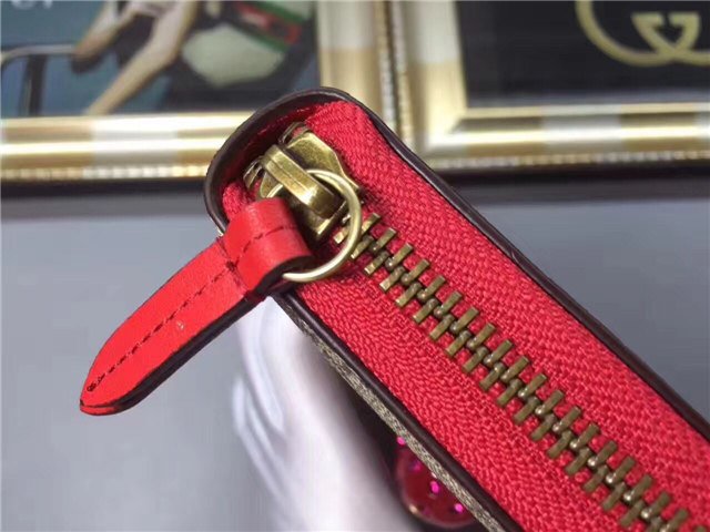 A three-dimensional cherry accessory with encrusted crystals stands out against the GG background for a playful touch. GG Supreme canvas, a material with low environmental impact, with hibiscus red leather trim Cherries accessory with encrusted crystals.