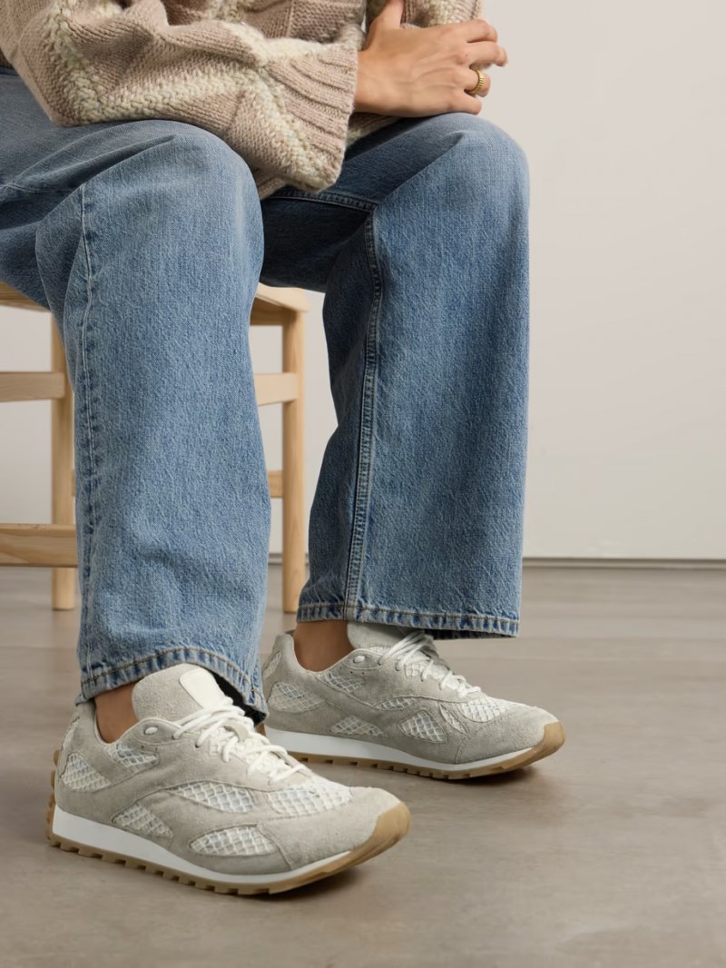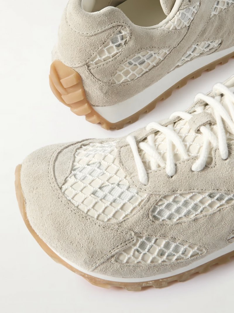 - Off-white suede and leather, white fishnet and mesh