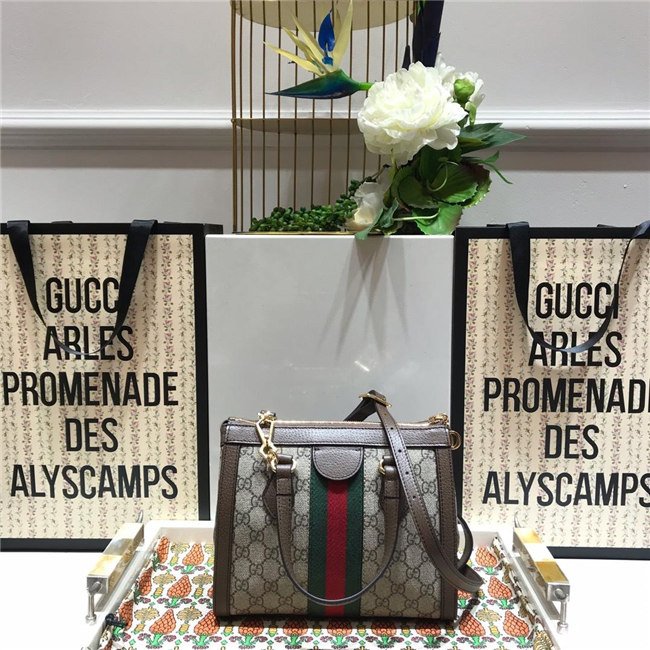 The world of Ophidia evolves with the introduction of a small top handle tote with a detachable shoulder strap. Crafted in GG Supreme canvas with inlaid green and red Web stripe, the accessory is enhanced by a petite play on the Double G, an archival Gucci code from the ”70s that appears atop a leather tab detail and on the zipper pull.