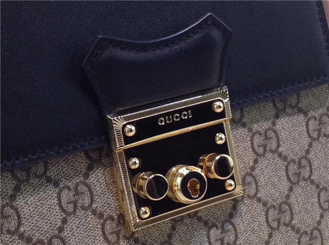 The structured backpack features defining details from the Padlock collection, in GG Supreme canvas with black and brown leather trims. The chain top handle is distinctive to the line, along with the key lock closure pulled straight from the archives. The key is placed in a detachable leather key case.