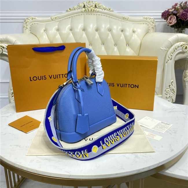 One of the House’s most recognizable bags, the adorable Alma BB handbag gets a sporty makeover thanks to a new Jacquard strap. The fashionably wide strap is embroidered with Louis Vuitton on one side and Monogram Blossoms on the other, and features delicate stitching along its edges. Made from colorful Epi leather, this bag will definitely turn heads.