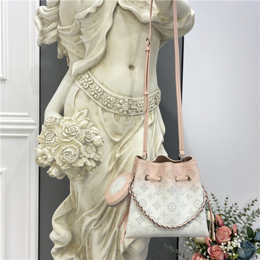 The Bella bag is reinterpreted with a delicate gradient color animation on the iconic Mahina perforated calf leather, with tone on tone calf leather trim. The gradient halo effect is achieved by spraying the dye by hand to gradually pigment the leather, making each bag unique. This small bucket bag is secured with a drawstring and includes a detachable, round coin purse.