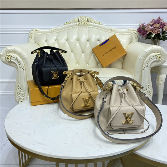 The Lockme Bucket bag in grained calf lather is immediately recognizable by its faceted LV turn lock on the front pocket. This supple bag with curvy proportions is comfortable to carry. The removable and adjustable strap in leather means it can be worn on the shoulder and cross-body, while a removable top handle enables hand and elbow carry.