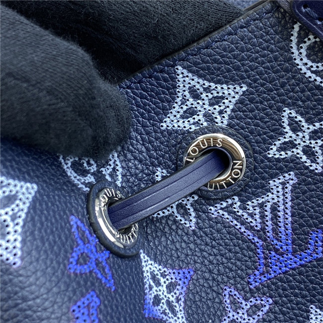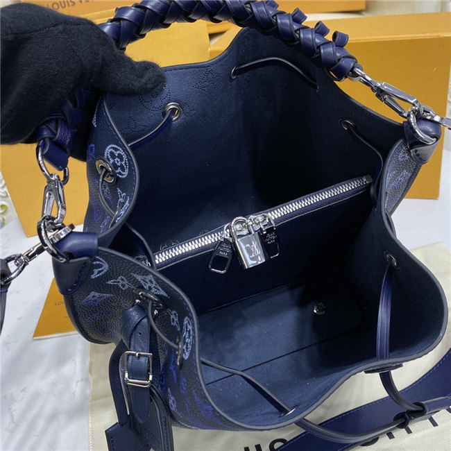 Perfect for plane travel, the Muria tote bag is made from supple Mahina perforated calfskin. The perforated Monogram pattern in the navy-blue calfskin is highlighted by the gradient whites and blues on the LVs and Monogram Flowers. A braided handle enables hand and elbow carry while a removable leather strap allows comfortable shoulder and cross-body wear.